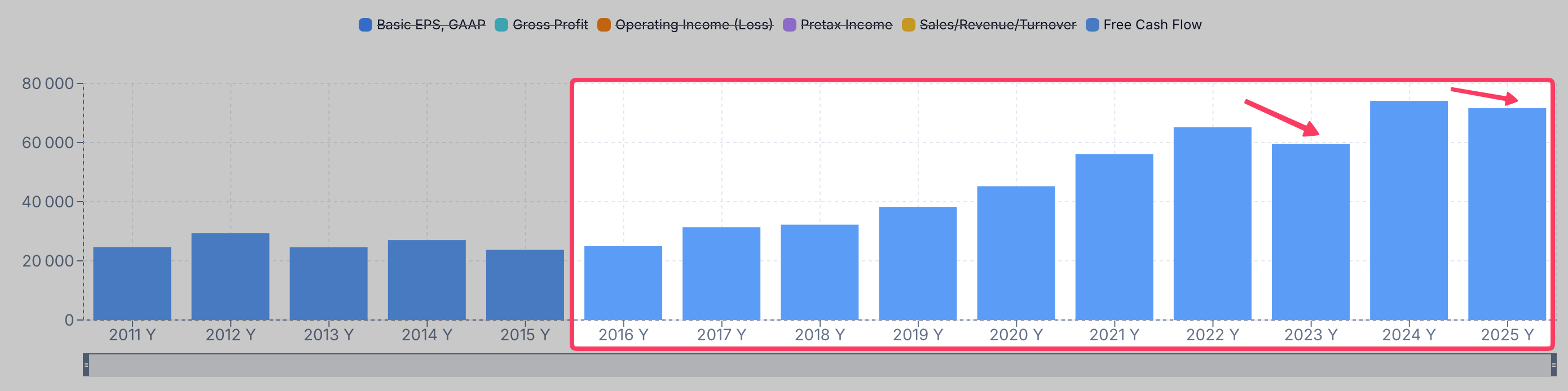 C'est très solide (>20%), mais en dessous du seuil d'excellence de 35%. L'investissement dans l'IA pèse temporairement.👉 Note : +1 point -