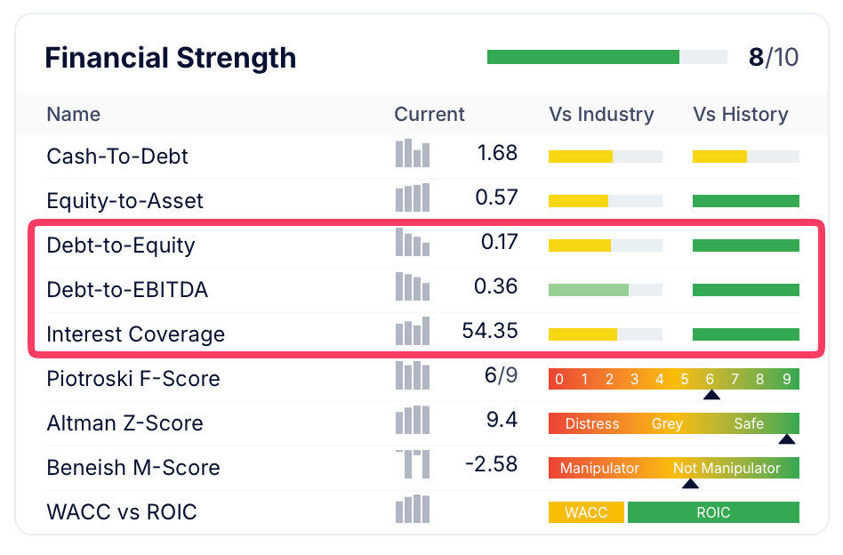 - Debt-to-EBITDA : 0.36 (< 1). Elle pourrait rembourser toutes ses dettes en 4 mois de travail. Bilan Forteresse. 👉 +2 points